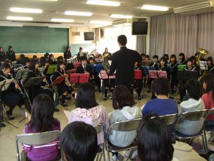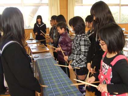 金管バンドの児童が、一宮高校を訪問し、吹奏楽部のみなさんと楽しいひと時を過ごしました。金管楽器は腹式呼吸の方法、打楽器は、ばちの持ち方やたたき方を教わりました。吹奏楽部の温かい雰囲気に包まれて、子どもたちはとてもいい体験ができました。