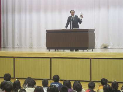 2.7 児童朝礼 公開日 2011/02/07 更新日 2011/02/07 学校ニュ−ス 今日の児童朝礼では、校長先生から読書週間にちなんで本の紹介がありました。本をたくさん読んで心の栄養にしてくださいというお話でした。