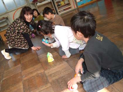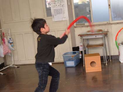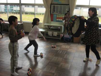 大きな太鼓をたたいたり豆まきの歌に合わせてボールを投げて音を出したりしました。