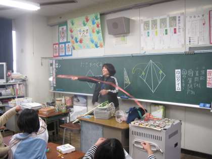 今日のものづくりクラブは、「たこをつくろう」と題して、たこづくりをしました。折り紙を使って小さなたこを作り、外でたこ上げををしました。