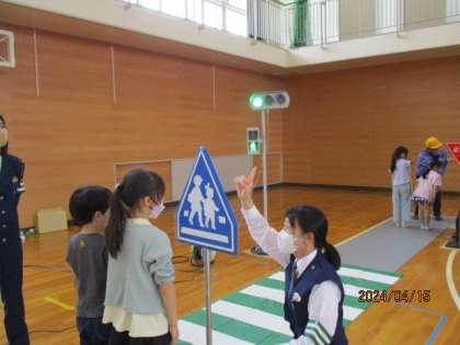 交通安全教室を通して、警察の指導者の方々の話を一生懸命に聞き、正しい交通ルールを学びました。交通ルールを確認する体験では、2年生全員、全力で取り組んでいました。