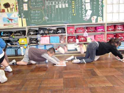 今日から3月、1年生は教室そうじをがんばっています。床ぶきも上手になりました。