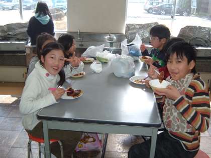 (上)3組 家庭科では最後の授業で、残り物で、安くて簡単にできるおやつ「お好み焼き」または「おやき」づくりをしました。残り物を使うことからエコクッキングになります。おいしくできて、みんな笑顔でした。