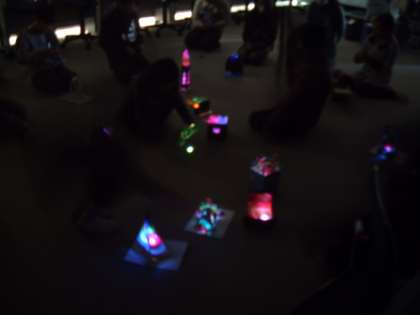 (下)1組 図工でライトの光の効果を利用した作品を作りました。パソコン室の暗闇で色とりどりの光を放ち、幻想的な世界が広がりました。。