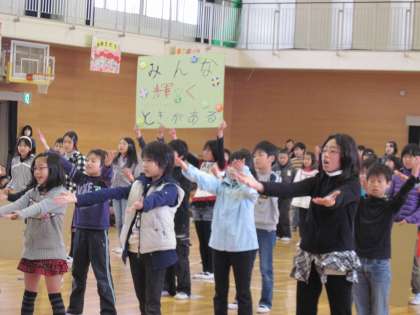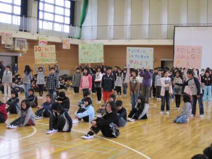 3年生の時に運動会で一緒に踊った「DO MY BEST]の歌と踊り、そして歌にこめられたメッセージを大きなボードに書いて伝えました。「自分に満足できるようにやろう」「みんな輝くときがあるからがんばって」「今よりもっと大きな自分を夢みて」「わたしたちはみんな大事な人」というメッセージです。