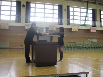 卒業式予行の後、卒業記念品授与式を行いました。最初に一宮市教育委員会からの記念品を校長先生より授与していただきました。次に、PTAからの記念品をPTA会長様より授与していただきました。その後、PTA会長様より卒業生にむけて、ご祝辞をいただきました。
