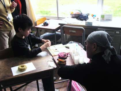 ドーナツの色やその上にかかったつぶつぶの色ができるように色を混ぜ、筆でていねいに塗ることができました。