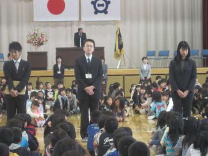 4.7 始業式 公開日 2011/04/07 更新日 2011/04/07 学校ニュ−ス 始業式で校長先生から「人のためにいやなことも進んでできるやさしい人になってください。」というお話がありました。その後、担任の先生の発表があり、「よろしくお願いします。」と、あいさつしました。