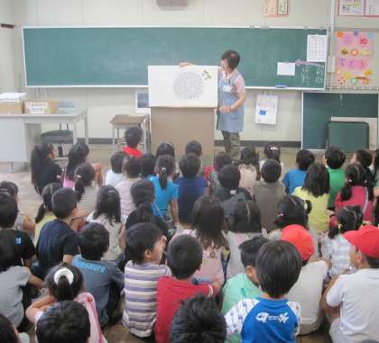 中間放課に図書館司書さんによる読み聞かせがありました。集まった子たちは大きな絵本に見入っていました。