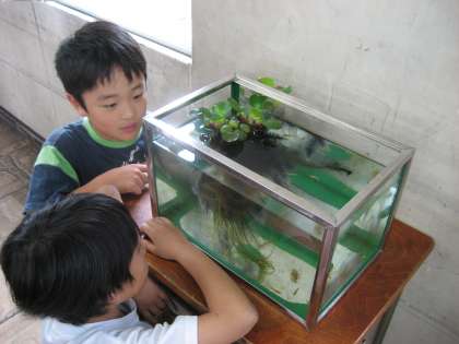 水槽の中を元気に泳ぐメダカを、楽しそうに見ています。