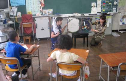 今朝の読書タイムに、読み聞かせボランティアの方に来ていただきました。大きな絵本を使っての読み聞かせに、子どもたちは興味津々でした。読み聞かせの後、子どもたちとの触れ合いもあり、楽しい時間となりました。