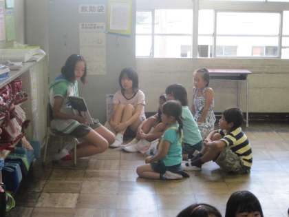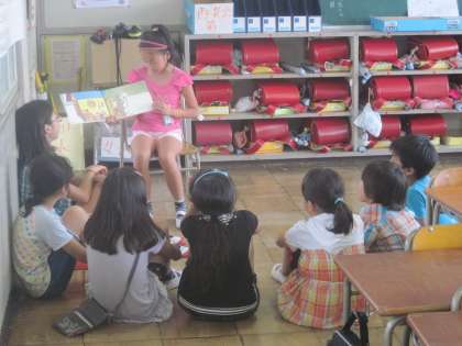 給食後、縦割り班の教室で「なかよし読書」を行いました。6年生が絵本の読み聞かせをやってくれました。6年生の読み聞かせに、みんな真剣に見入っていました。