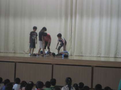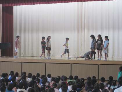 今朝の児童集会で、保健委員会によるケガ予防についての発表がありました。現在のケガ発生状況をグラフにして発表した後、ケガが起きやすい場面を寸劇で演技してくれました。