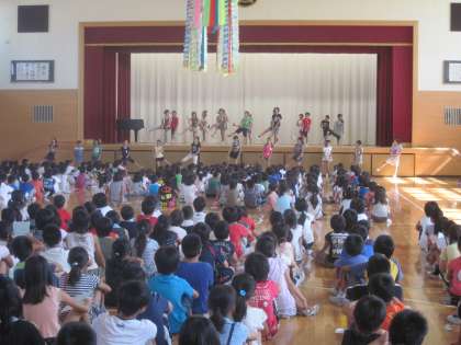今朝の児童集会では、ダンスクラブの発表がありました。最後に今月の歌「少年少女冒険隊」をみんなで歌って踊りました。