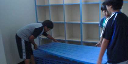 (中):台風の接近に伴い、終業式後に働く6年生たち。快く手伝ってくれました。