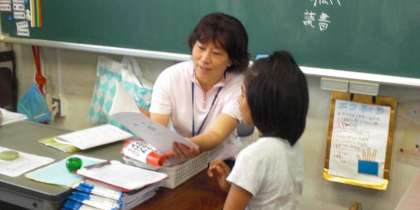 (下):教室で「あゆみ」を受け取り、1学期の成果を確かめました。