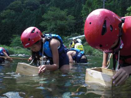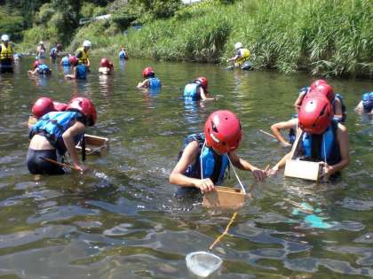 箱めがねとふせ網を使って川の中をのぞき込み、熱心に魚を探しました。