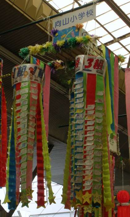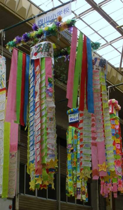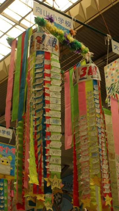 31日まで行われる一宮七夕まつりが今日から始まりました。全校のみんなの願い事をかいた七夕かざりが、本町1丁目のアーケード街にあります。クラスごとにまとめ、それを1組・2組・3組の輪に飾りました。