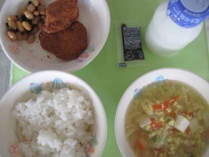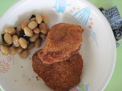 ごはん かきたまじる とんかつ こんぶまめ 牛乳