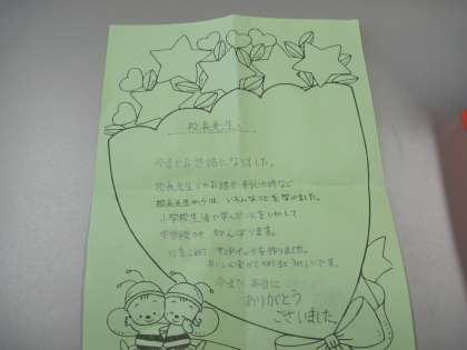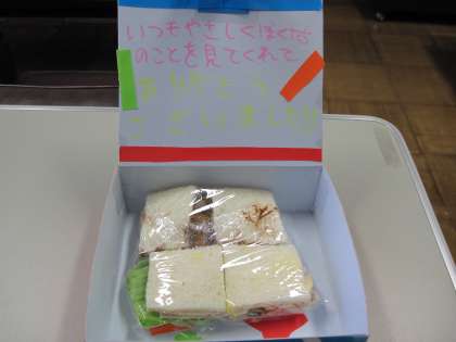 6年生が調理実習で作ったサンドイッチを持ってきてくれました。手作りのきれいな箱の中に、手紙とサンドイッチが入っていて、とても感激しました。手紙には、感謝の気持ちが書かれ、もうすぐ卒業なんだなあと改めて感じました。心のこもったサンドイッチをおいしくいただきました。6年生の温かさを感じたひとときでした。