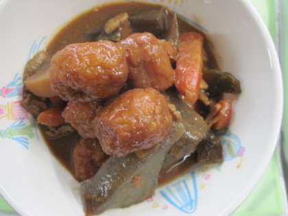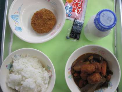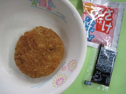 ごはん みそおでん キャベツミンチカツ さけふりかけ 牛乳