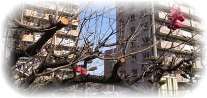 北舎の裏手にある紅梅の蕾が、やっとほころび始めました。