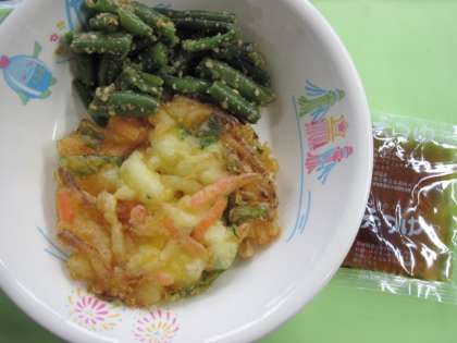 かきあげは、おいしくいただきましたが、いんげんのごまあえは、苦手な子が多かったようです。