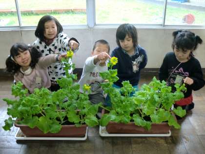 教室で育ててきた菜の花が黄色い花を咲かせました。
