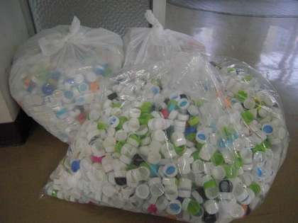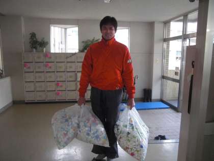 みんなで集めたペットボトルキャップが大きな袋3袋分になりました。たくさん集まったので、地球環境保護団体「チーム プレッジ オブ アース」の方に引き取ってもらいました。