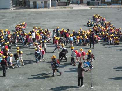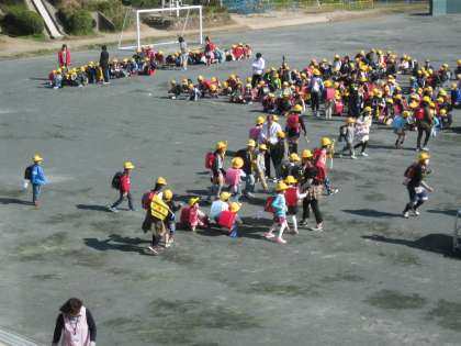 今日は3回目の一斉下校です。最初に、班長さんが1年生を自分の班に連れて行き、場所を教えています。