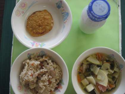 ごもくごはん わかたけじる れんこんサンドフライ 牛乳