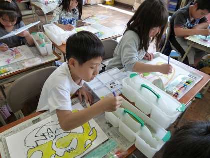 (下)図工の授業で、混色の学習をしました。丁寧に色塗りをすることができました。