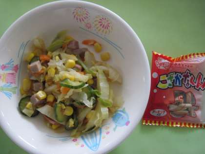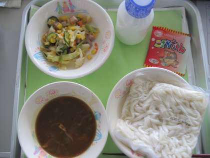 大好きなカレ−うどんをうれしそうに、食べていました。サラダやこざかなも、おいしくいただきました。