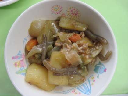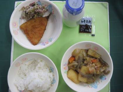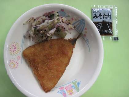 ごはん じゃがいものそぼろに あじフライのあまみそかけ キャベツのしそあえ