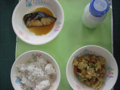 むぎごはん こうやどうふのたまごとじ さごしのてりやき 牛乳