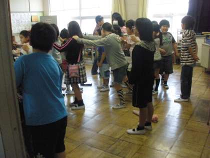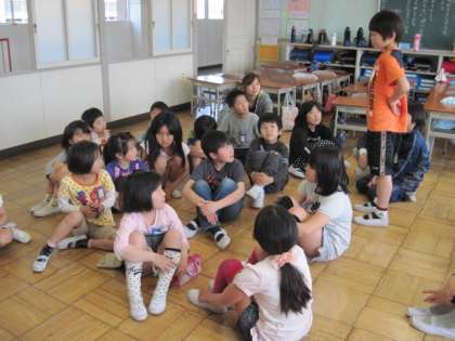1〜6年生を21の班に分け、6年生がリーダーとなって行う縦割り班活動の顔合わせ会を行いました。自己紹介をして、その後、ミニゲームをして楽しみました。