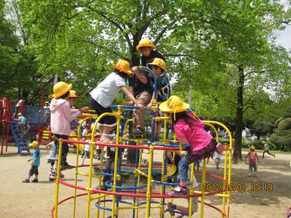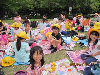 1年生と2年生は、春の遠足で、彦田公園と梅が枝公園に行きました。彦田公園では、1・2年のペア班で仲良く遊びました。次に、梅が枝公園では、ペア班で、お弁当を仲良く食べ、そのあとで、遊具や2年生が考えた遊びで、1年生と一緒に遊びました。どの子もたくさん話し、いっぱい遊びました。とっても楽しい時間でした。