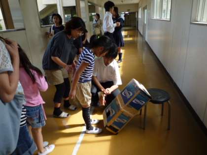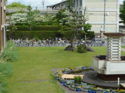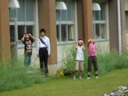 作った日食メガネで、早速太陽を観測しました。丸く見えた太陽の形に「すごい!」「きれい!」。段ボール箱を利用した手作り観測器でも太陽の形を確認しました。5月21日が待ち遠しいです。向山の子は、自転車の整頓もしっかりできました。