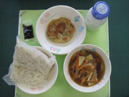 しらたまうどん ごもくうどん キャベツたっぷりおこのみやき 牛乳