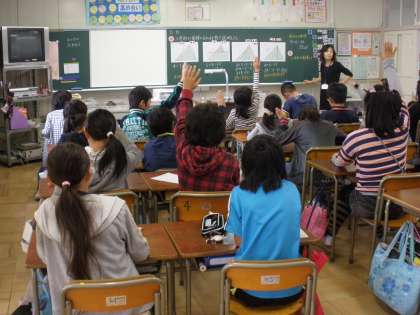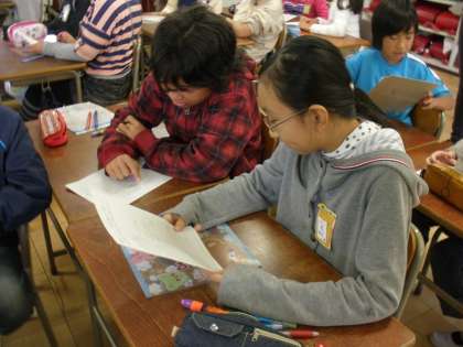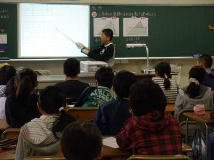 算数の授業で「面積」を学習しています。既習の長方形の面積の求め方をもとに三角形の面積を工夫して求めていきました。考えたことをワークシートにかき、お勧めの方法をペアで伝え合いました。考えたことを実物投影機で映しながら説明し、4通りの方法を見つけ出しました。最後に自分のことばでまとめをしました。
