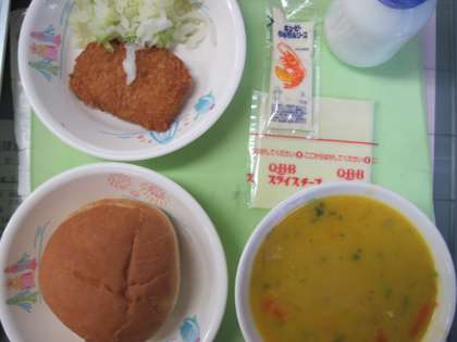 サンドイッチバンズパン パンプキンクリ−ムス−プ フィッシュバ−ガ− ボイルキャベツ スライスチ−ズ 牛乳
