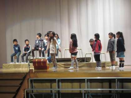 間もなく学芸会です。劇も完成が近付いてきました。今日の練習では、マイクの位置と子どもたちの立ち位置の確認をしました。