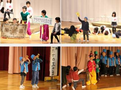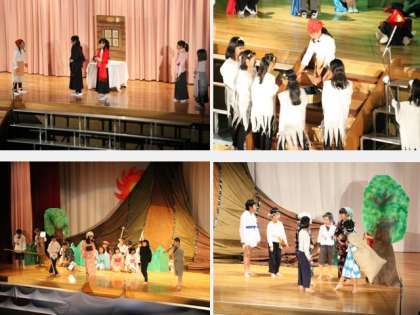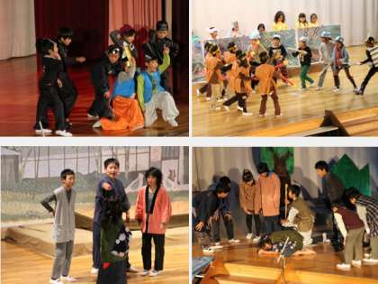 学芸会のスローガン「最後まで 夢いっぱいの 表現を!」をもとに演技しました。自分のせりふや演技に気持ちを込めて表現しました。