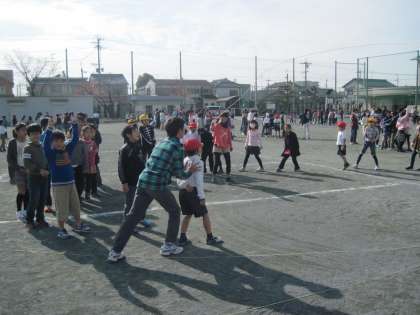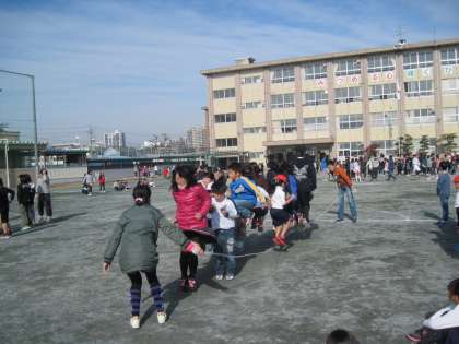 中間放課に縦割り班で長なわとびの練習をしています。「14人跳び」と「8の字跳び」です。6年生が低学年の子に入るタイミングを教えたり、みんなが跳びやすいようになわを回したりしています。