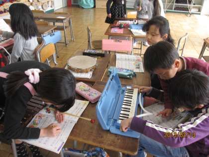 音楽の学習で合奏に取り組んでいます。今日は、どの楽器を担当するか、それぞれのグループで話し合い、練習を始めました。リズムが分からなくても友達同士で教え合い、「じゃあ、いくよ。1、2の3はい!」と声をかけ合いながら取り組んでいました。子どもたちだけで練習を進めていく姿は頼もしく思えました。合奏発表会が楽しみです。