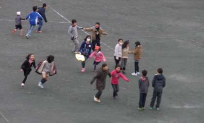 縦割り班でふれあい遊びをしました。今日は3組班です。6年生の班長を中心に話し合い、「手つなぎおに」や「田んぼの田」「だるまさんがころんだ」などみんなで楽しめる遊びを計画しました。6年生は、低学年に遊び方を教えながら1〜6年生が一緒になってなかよく遊びました。