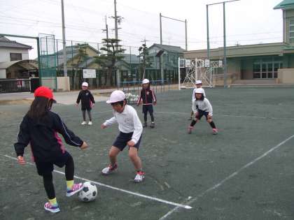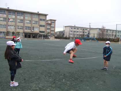 今日の体育の時間、ゴムを跳んだり、くぐったりして遊びました。その後、みんなでシュートゲームをしました。チームで作戦を考えたり、声をかけ合ったりして、みんなで仲よく楽しくゲームができました。