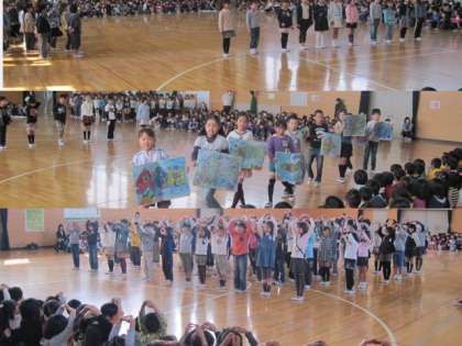 1時間目に、1年生を迎える会を行いました。6年生と一緒に入場した1年生は、プレゼントの首飾りをかけてもらいました。2年生から6年生までが各学年ごとに、向山小学校の行事などを説明しました。最後に、1年生がお礼の言葉と歌を歌いました。