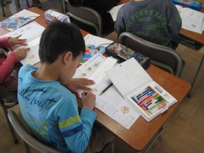 書写の時間にかたかなの練習をしました。「とめ」「はね」「はらい」「おれ」「まがり」に気をつけて書きました。