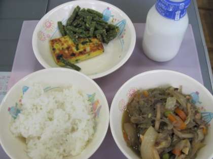 ごはん ぶたにくといとこんにゃくのいりに なつやさいととうふのよせやき